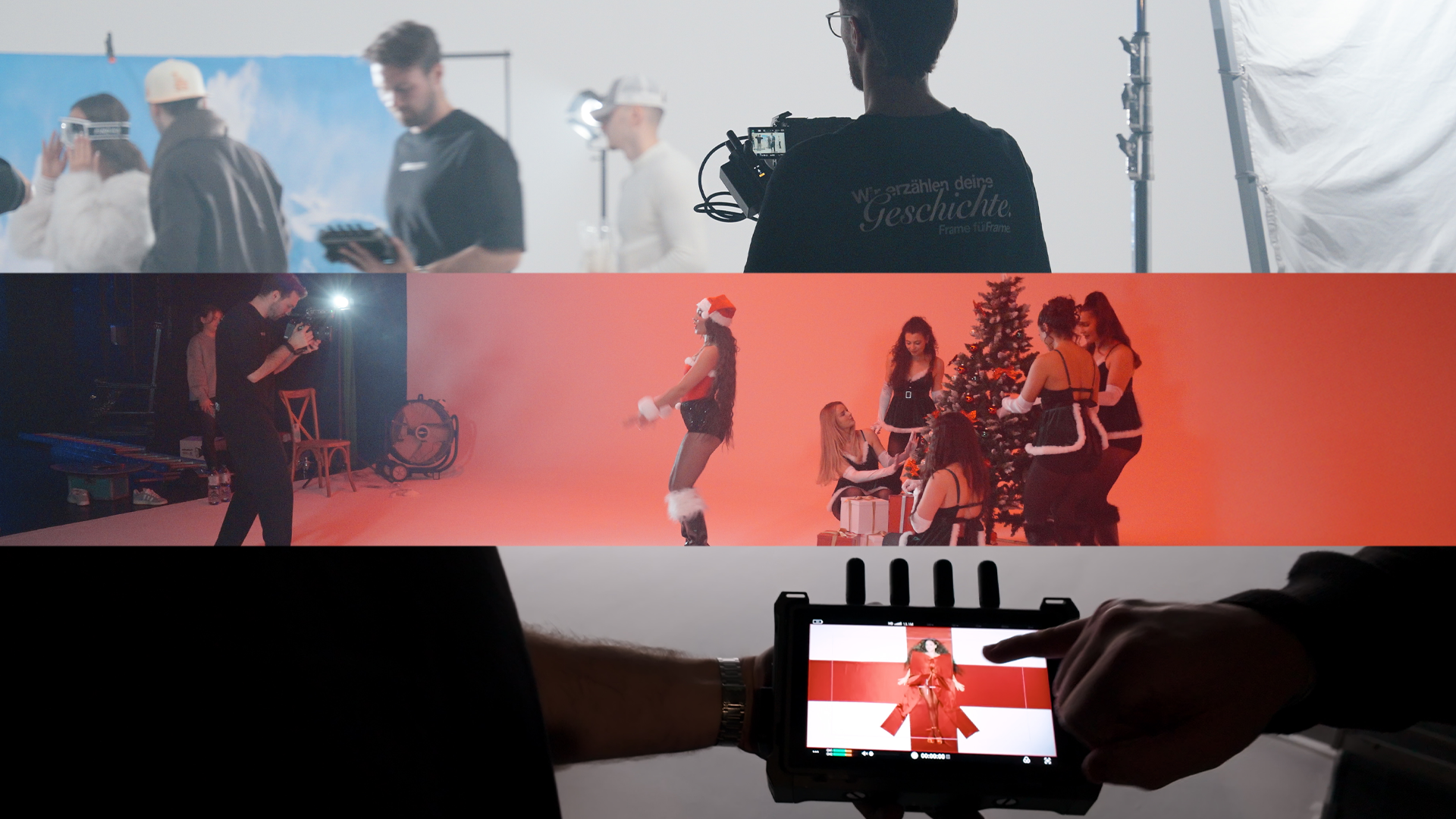 Für den intensiven 12-Stunden-Dreh war unser Team zu dritt vor Ort: Eric als DOP, Jannis als Director und Jonathan als Assistent. Gedreht wurde mit mehreren FX3-Kameras und verschiedenen Objektiven, einer VHS-Kamera, umfangreichem Lichtequipment und einem externen Monitor, sodass Jannis jederzeit die Kontrolle hatte und die Aufnahmen direkt mit Maddy abstimmen konnte. Ziel war es, dass der Zuschauer sofort den vibe des Songs und Maddys Charakter spüren kann.